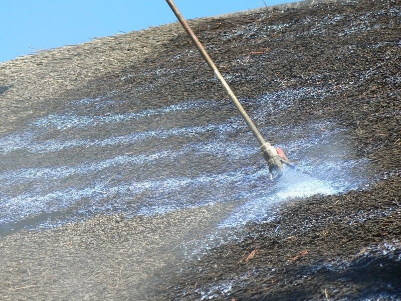 Trained BLUSPRO personnel apply BLUSPRO FR100 flame retardant by high-pressure spraying to new or refurbished thatch roofs. Protection on both sides (the exterior and interior) is recommended. BLUSPRO FR100 flame retardant is safe to workmen and inhabitants. It is water-based, and cures within one hour after application and does not release toxic volatile organic compounds. It is environmentally safe; its main ingredient is phosphate (phosphate is a common ingredient in agricultural fertilizer and in well-known soft drinks). The water-insoluble phosphate used in BLUSPRO FR100 imparts flame-retarding properties, limits run-off with rainwater and prolongs the fire retardant properties of the treated thatch. In addition, BLUSPRO FR100 also provides UV and biocide protection.